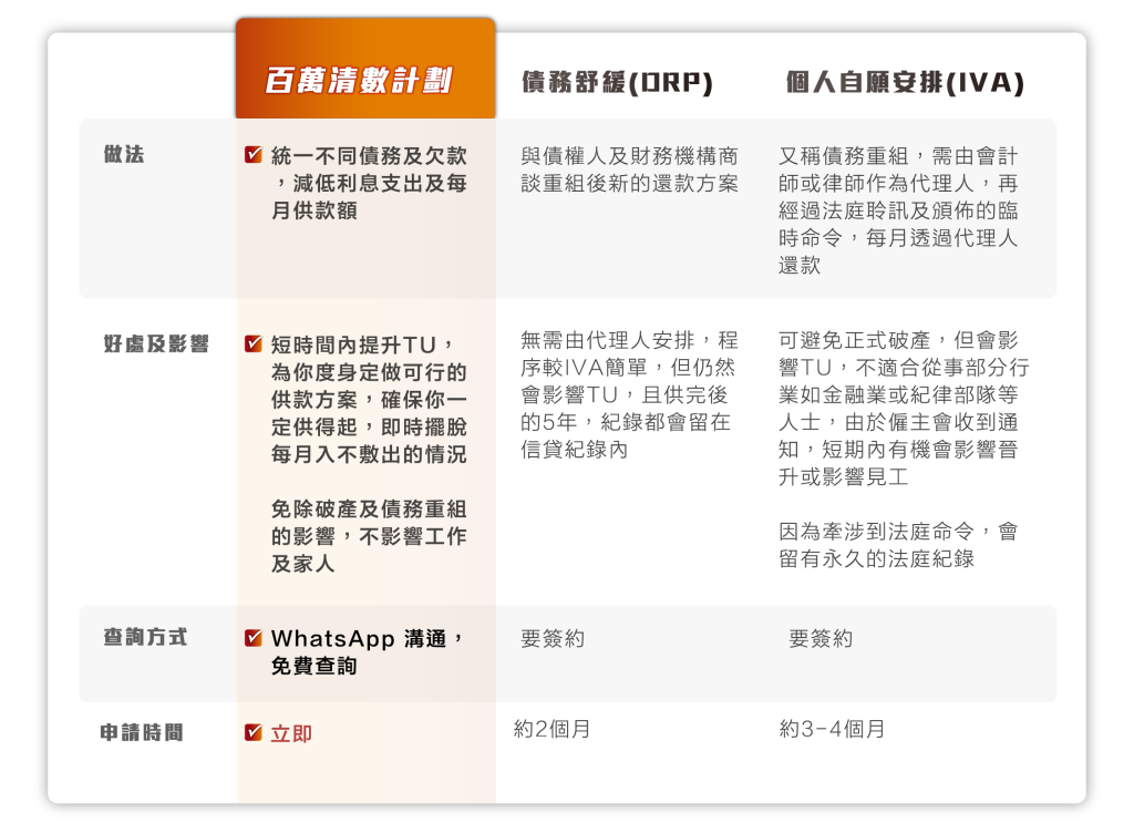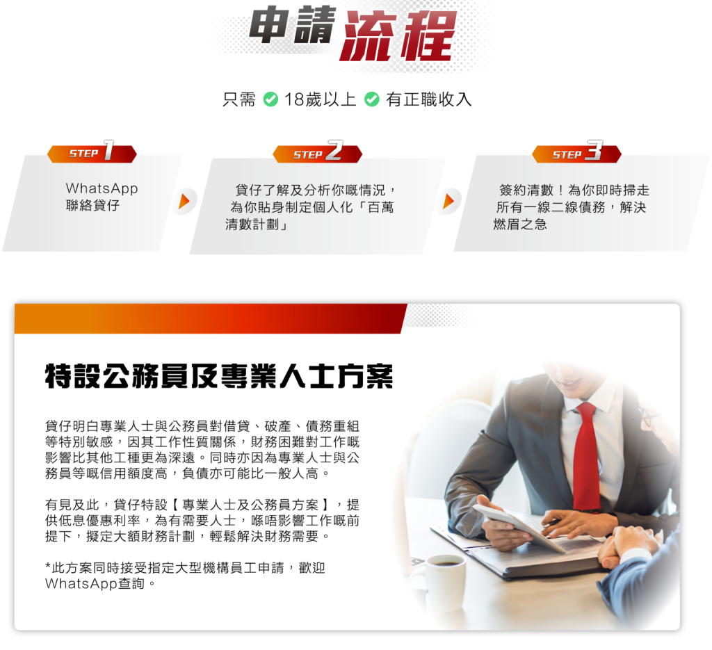 方案經理具有十多年的銀行服務經驗。而且我們只會與正規、信餐良好的二線財務公司合作,提供無憂慮式二線清數。我們可以為你在還款協議上,爭取長達48期的還款期。如符合審批資格,我們更為你可以爭取更長的還款期數,及特惠利息,我們會確保您獲得低利率和舒適的還款方式,解決你的債務問題。